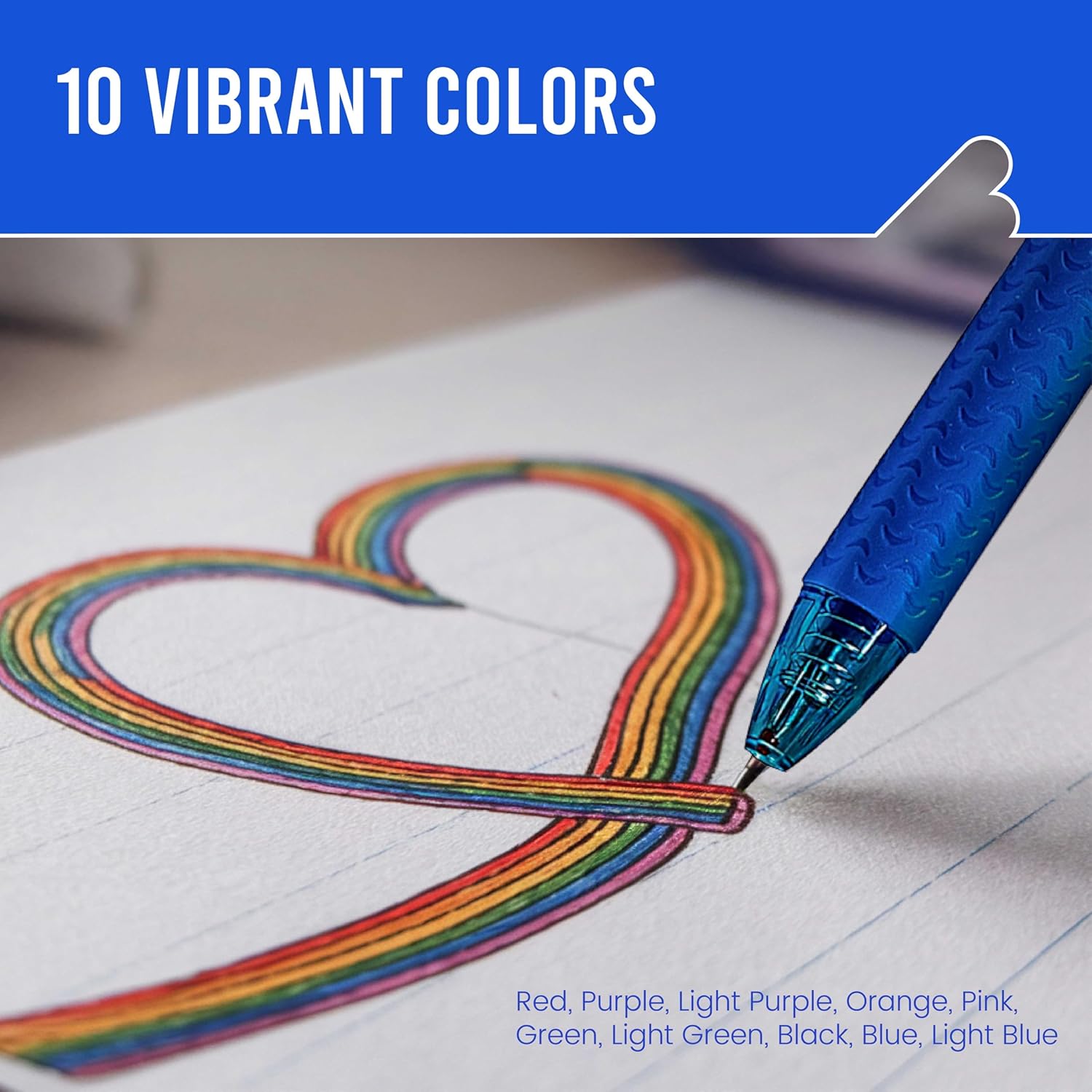 Vibrant Color Selection: Enjoy a 10-pack of erasable pens with each pen offering a unique, vivid color, from classic black and blue to fun shades like pink, green, and light purple. Perfect for adding color and personality to your journaling kit, college notes or at the office.