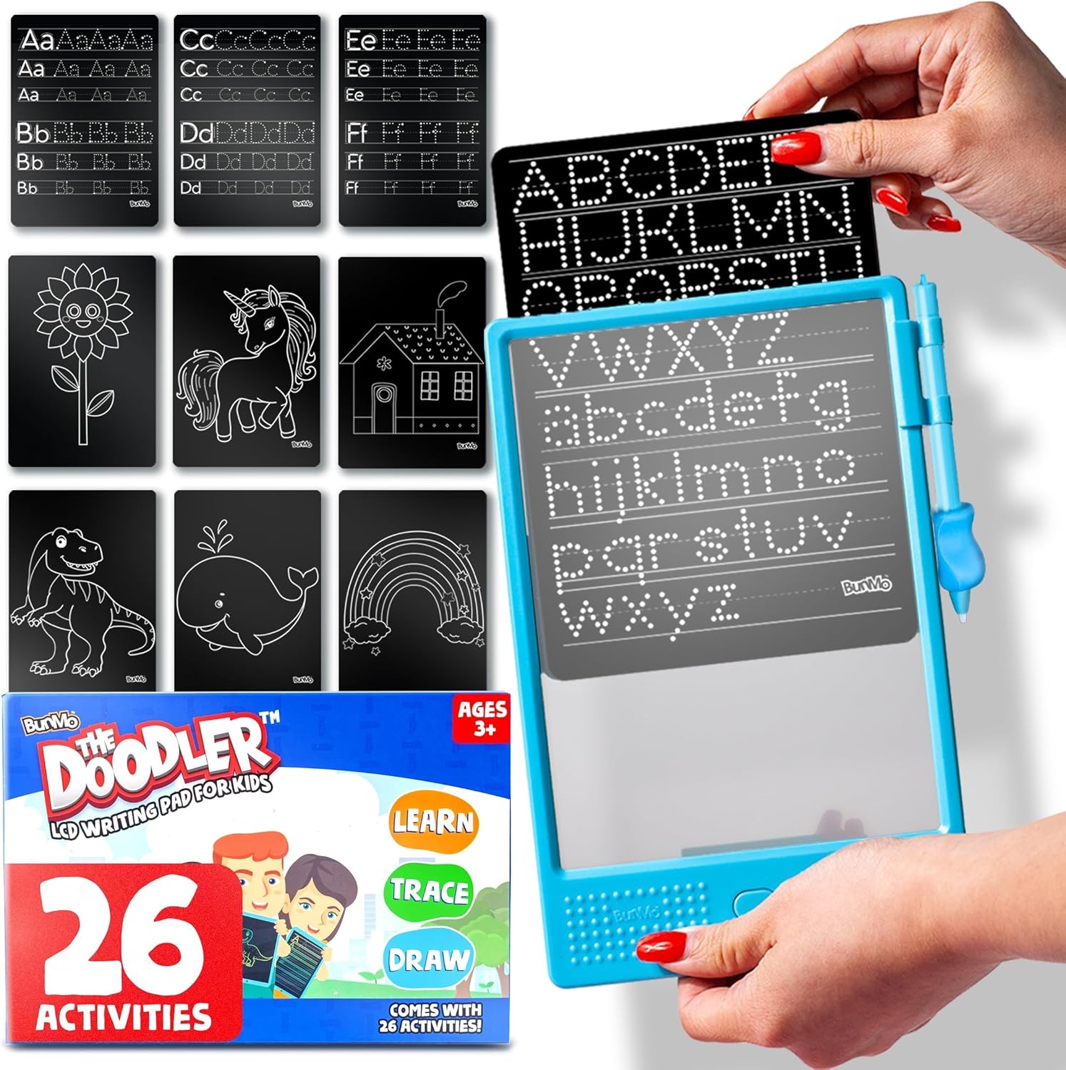 All-in-One Creativity - The BunMo Doodler Writing Pad is a versatile writing tablet for kids and a doodle board combined. It includes an LCD writing tablet, 26 unique activity inserts, a pen plus grip for comfort and pen strap and clip to keep it safe and secure.